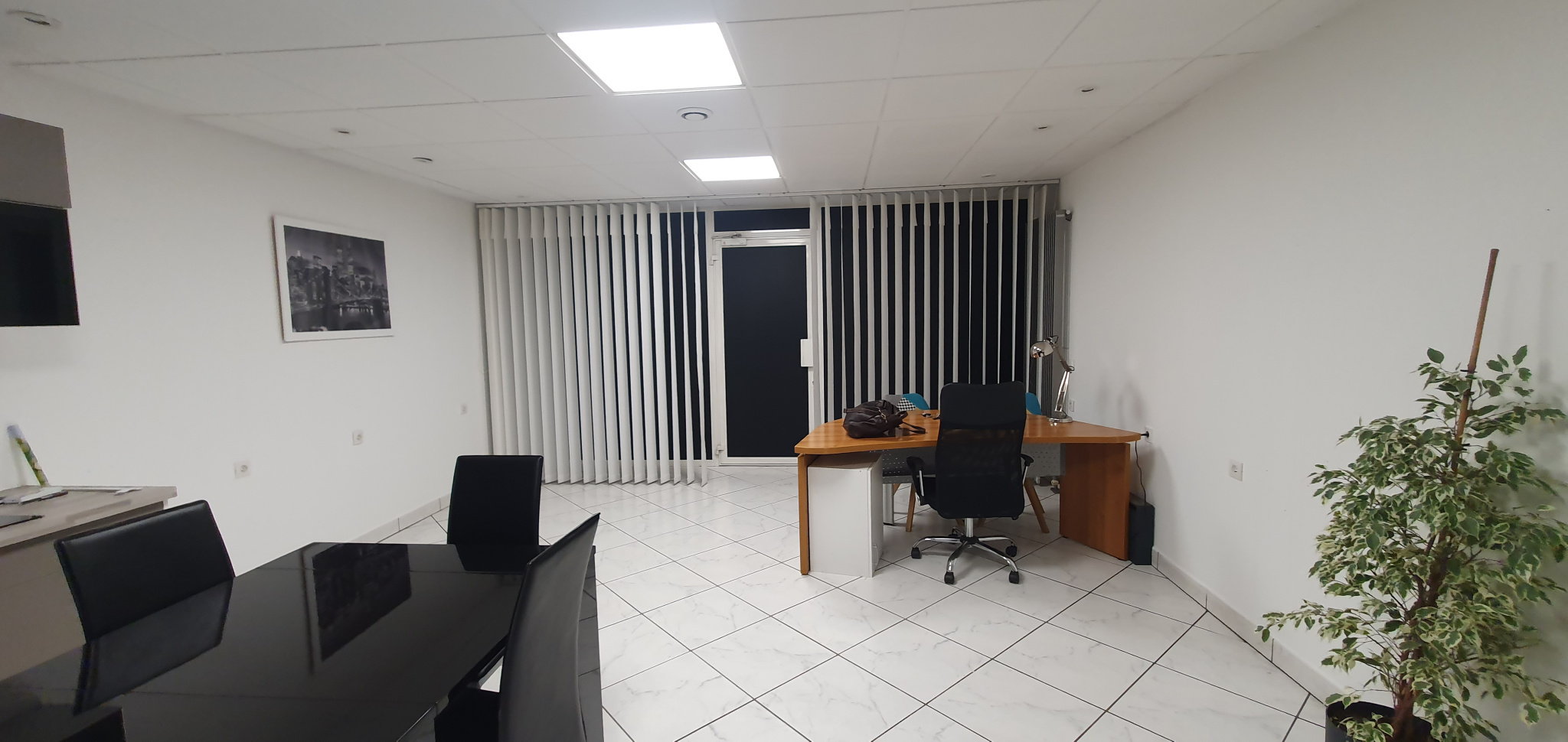 De plein pied soit une grande pièce pouvant etre divisée, bureaux avec rangement, sd douche et wc.