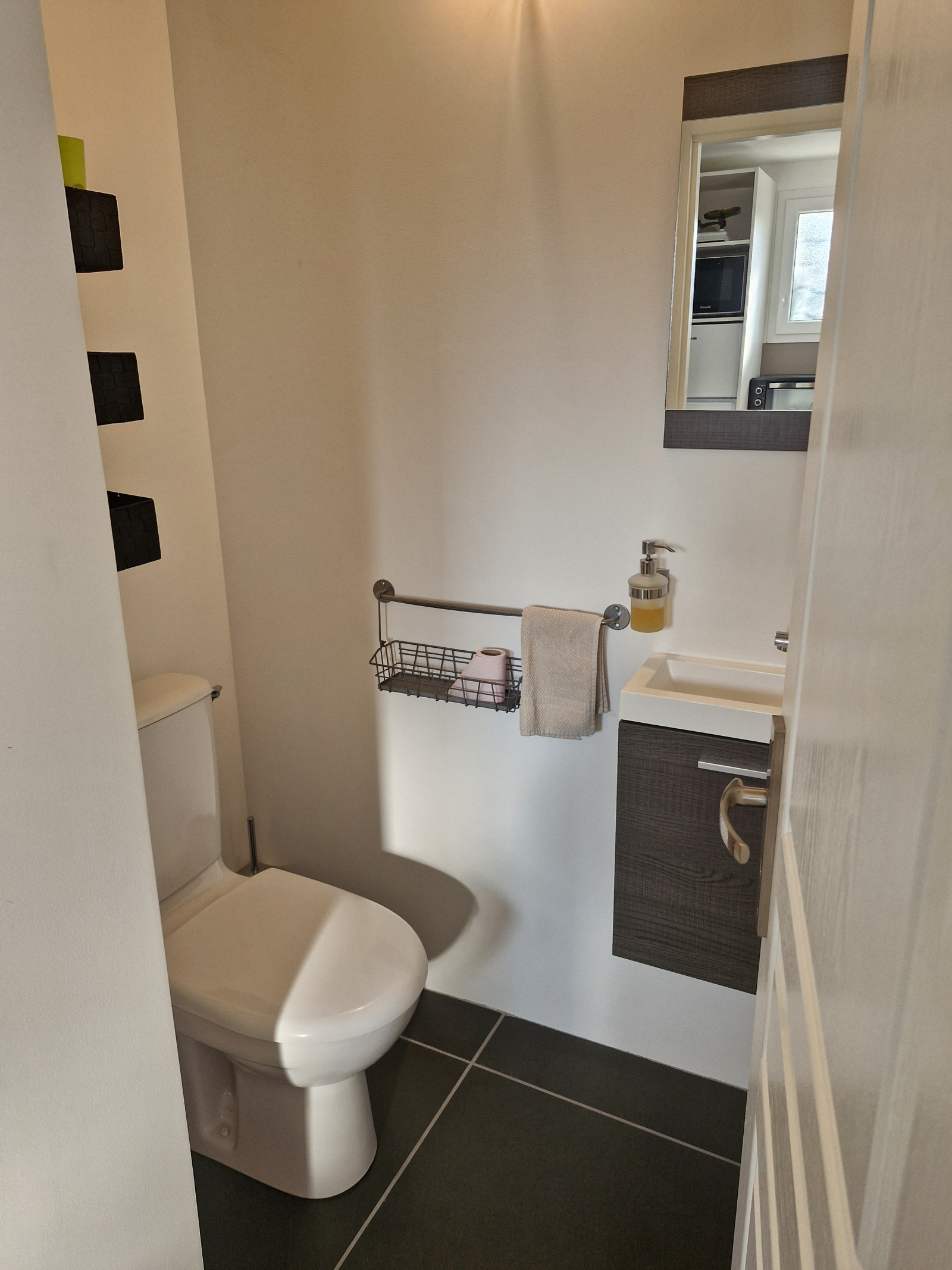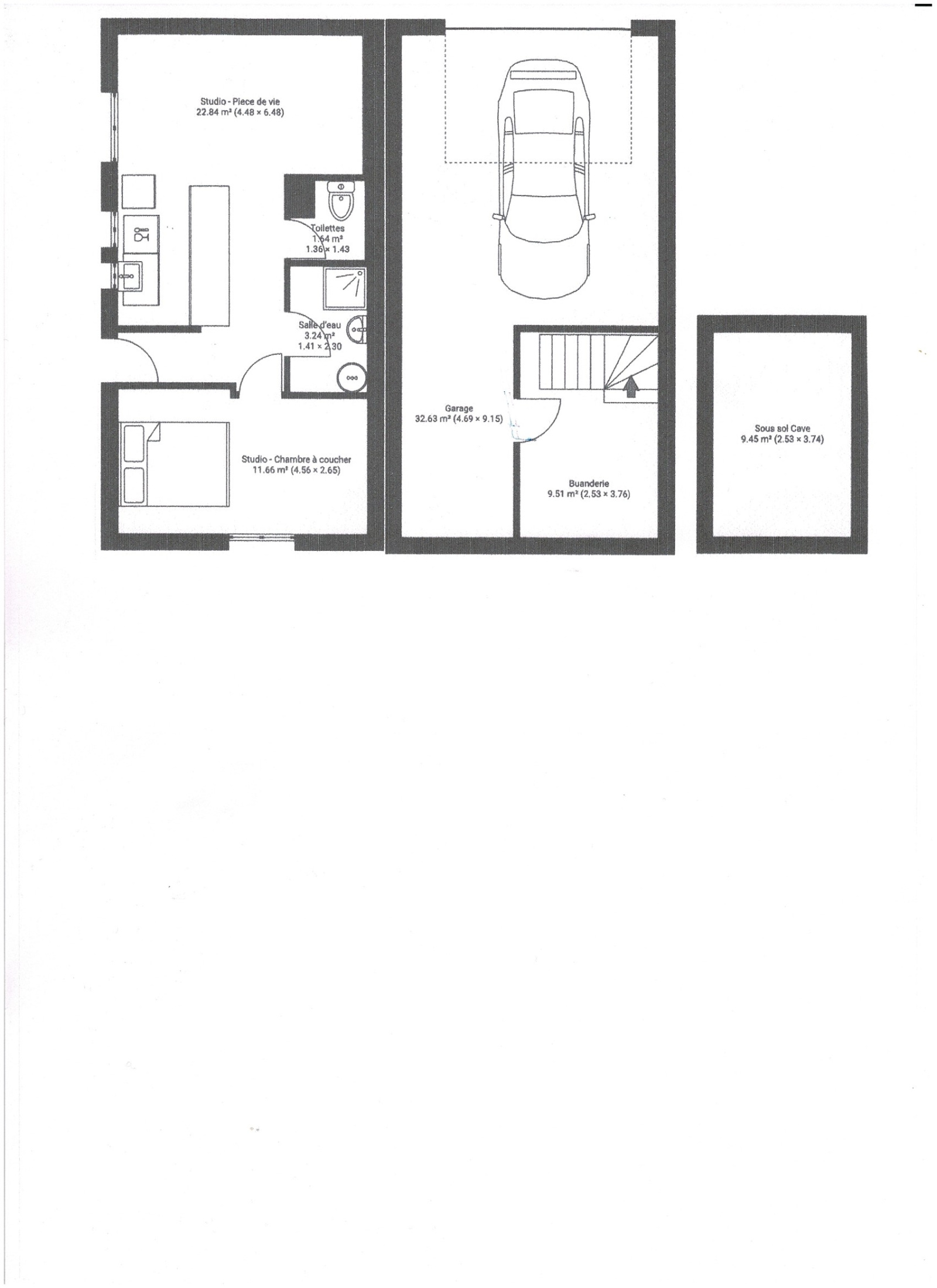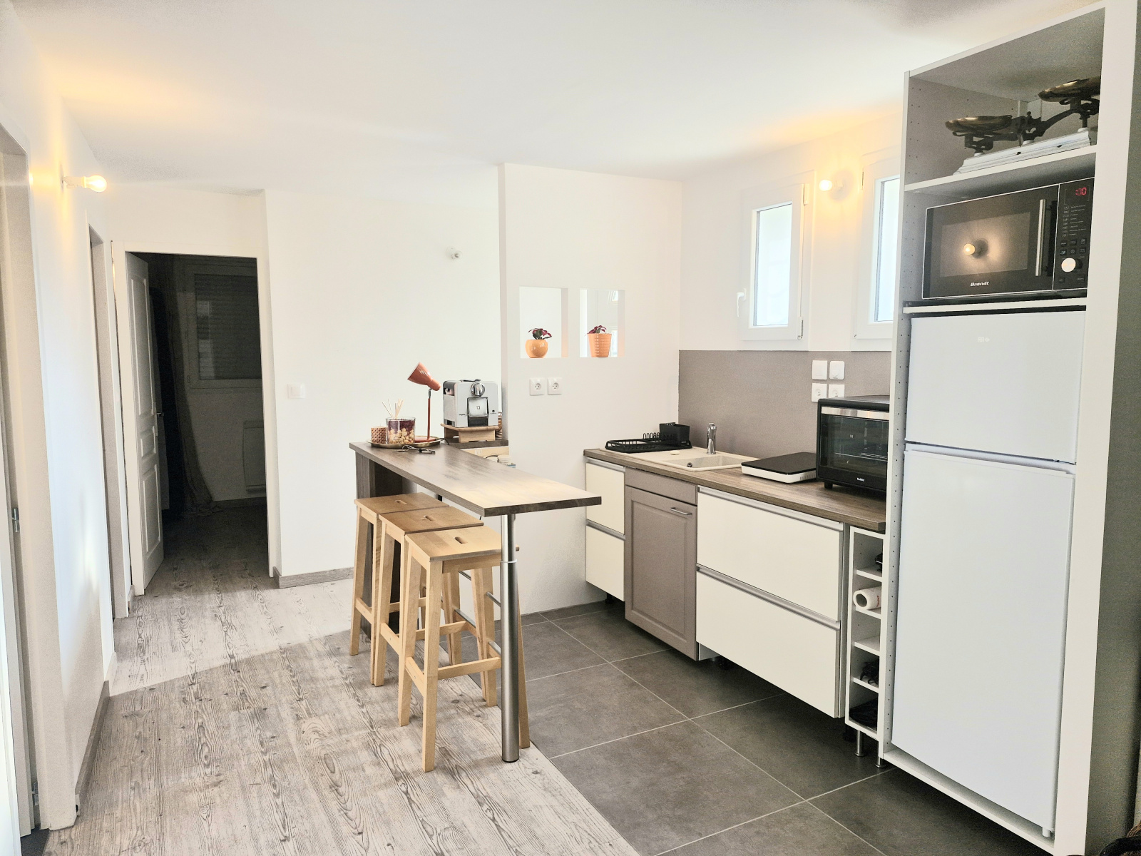 RDC : T2 avec cuisine équipée salon et chambre sdb wc.
